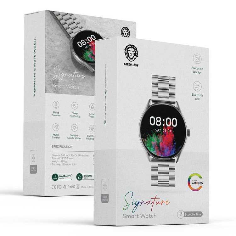ساعت هوشمند گرین لاین مدل Signature نمایشگر 1.43 اینچی، از نوع Amoled Super و گرد دارد که در ابعاد 46 × 18× 10.5 طراحی شده است. جنس بدنه این ساعت آلومینیومی و بند آن فلزی است. بنابراین برای کسانی که به بندهای فلزی علاقه دارند، مناسب است. همچنین قفل بند آن از نوع قفل مخفی است. وزن این ساعت 120 گرم است. بدنه و بند فلزی این وزن را توجیه میکند. این ساعت در رنگ نقرهای طراحی شده و برای طرفداران این رنگ انتخاب مناسبی است.